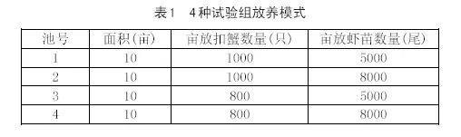 (4)放養(yǎng)模式:至312日長江1號扣蟹全部放齊,520日南美白對蝦苗放齊。設(shè)置4種不同放養(yǎng)密度進(jìn)行試驗(yàn)研究,詳見表1。