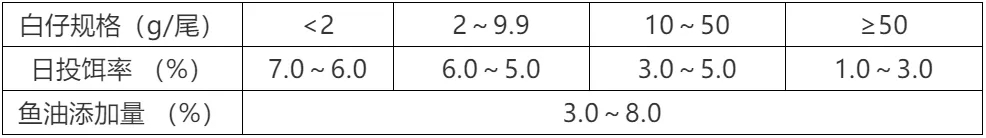 ? 根據(jù)存池白仔的規(guī)格及數(shù)量、氣候、水溫、水質(zhì)、白仔的生長及攝食狀況等因素進(jìn)行適當(dāng)?shù)卣{(diào)整。