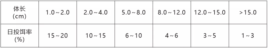 注:具體投喂量根據(jù)水溫、水質(zhì)和攝食情況適時(shí)調(diào)整。