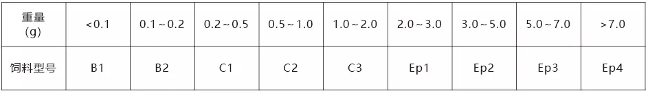 飼料適口性對(duì)石斑魚攝食及采食量產(chǎn)生很大影響,而飼料顆粒大小占飼料適口性很大一部分,在不同體重下對(duì)應(yīng)飼料規(guī)格見下表。